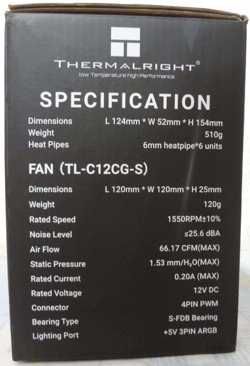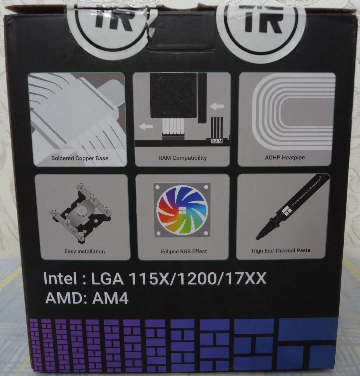 По цветастой упаковке сразу становится понятно, что перед нами модель из младшего сегмента Thermalright. На фронтальной стороне - 3D-модель кулера, название модели, указание поддержки нового сокета Интел (1700) и логотип производителя.