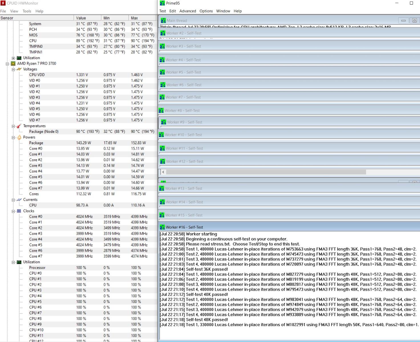 Prime95 30.5 (Small FFT,150Вт) - 20 мин прогон при максимальной нагрузке : на максимальных оборотах вентилятора, 7В и 5В (если возможно).