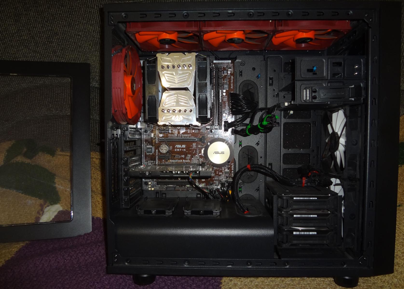 Работа с данным корпусом требует сноровки (если вы не захотите удалять упор для видеокарты). Слот 5.25" демонтируем (если требуется установка длинной видеокарты), а так он скрывает I/O кабели (USB 3.0, HD Audio). Три 120мм вентилятора идут в комплекте с корпусом. Фронтальные вентиляторы с модной подсветкой.