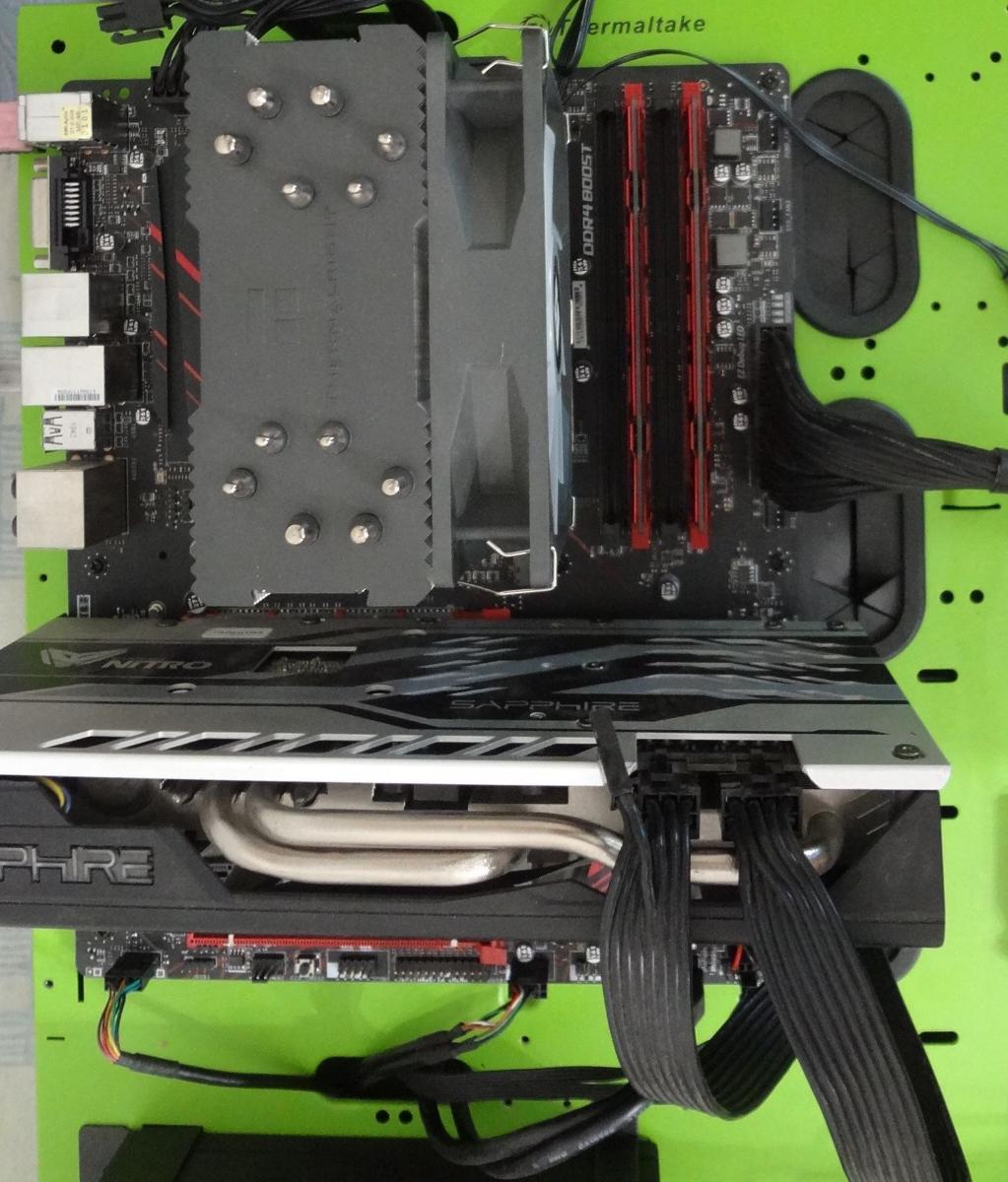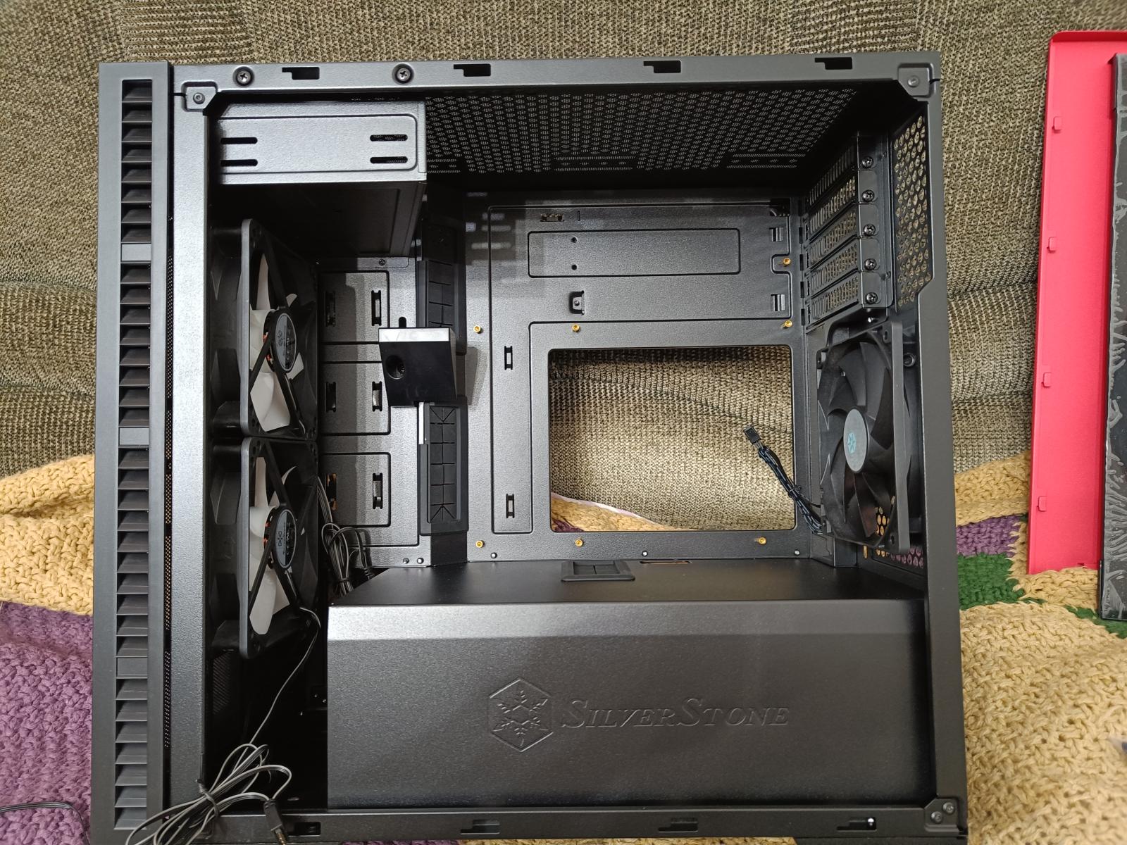 Корпус-перевертыш, формат - Slim-ATX. Материнская плата располагается в нем вверх ногами. Да, видеокарта находится у вытяжного вентилятора и не греет процессор, но при этом она подключается через комплектный райзер. Блок питания - SFX, корзина для накопителей - демонтируемая.