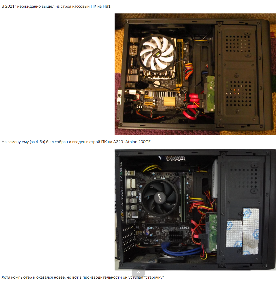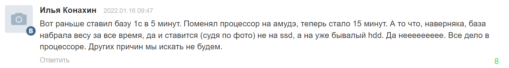 В чем разница между этими двумя ПК ни один из комментаторов так и не догадался. ПК на Интел - выполнял роль сервера 1С на 5 рабочих мест (да, попробуйте это просто принять и осмыслить), в то время как ПК на А320 - это "кассовый" компьютер, который подключается к серверу, на котором установлена База. А зачем тогда ЖД? Да, действительно, зачем ?! Ведь только умственно одаренные используют Архивацию и восстановление из копии, а тру-юзвери ничего не архивируют! Мы же не лохи, верно ? И да, говоря про новый ПК я имел ввиду что там вся начинка абсолютно новая ( у меня на работе всегда есть в запасе ЖД и ССД, на всякий пожарный). А 1С у "миньона" - на ССД. И да - 15мин установки с ССД - это рекорд.