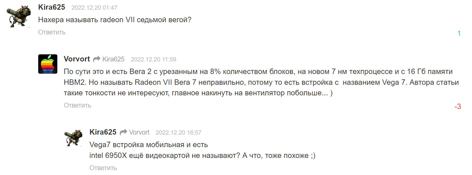 Vega7 и Vega VII - это таки 2 большие разницы, как говорят на Привозе. И если быть более точным, то Radeon VII - это Fury X 3. Ты ведь не будешь отрицать тот факт, что начало HBM-видеокартам положила R9 FuryX ? Вега 56 и 64 - это уже второе поколение, а Радеон 7 - третье. Я помню когда мне назвали цену Fury X, которой я весьма интересовался (технология НВМ-памяти весьма интересна, но мне уже в 2015г, после изучения документации стало понятно, что она осядет в серверном и проф сегментах), то я сразу ответил