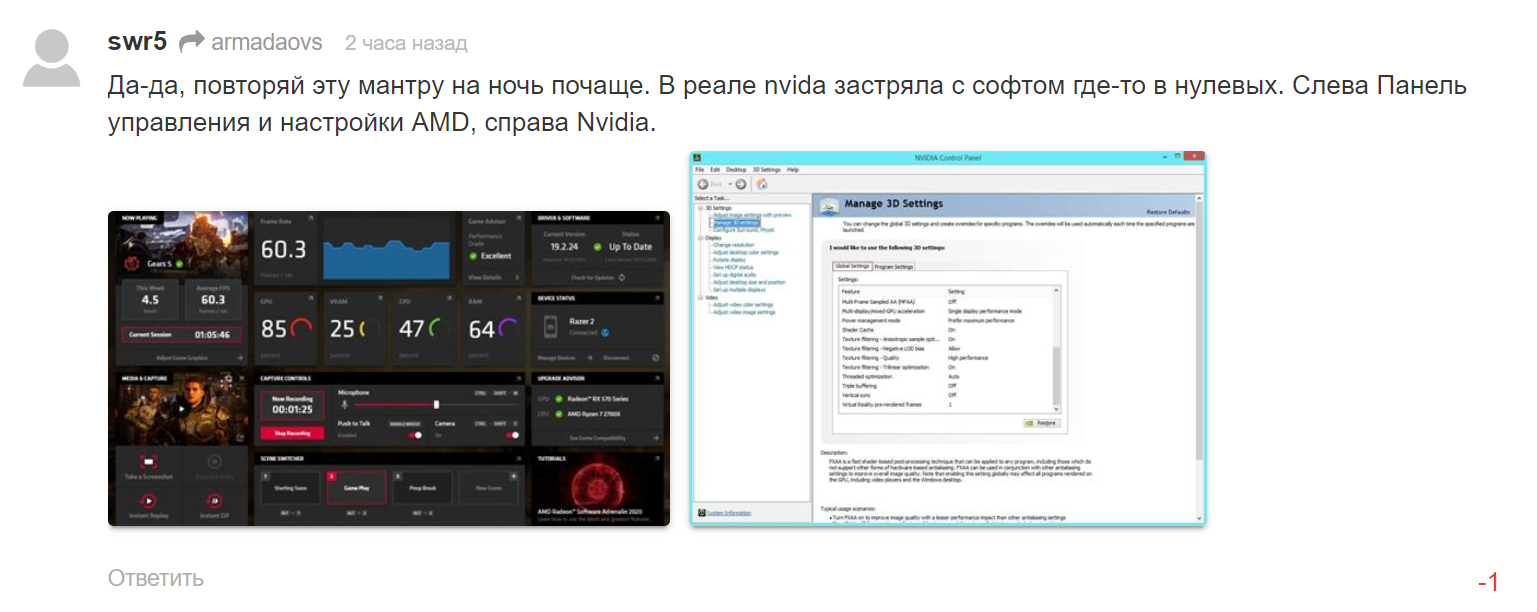 Качество софта определяет не цветастая обертка, а возможности тонкой настройки. И вот с этим у Нвидиа все хорошо. А для даунвольта и тонкой настройки видеокарт Aфтебернер+RTSS все еще остается бессмертным сочетанием. И лучшим для любого пользователя. А Ваттман в дровах АМД работает через всем известное место. Точнее он просто не работает.