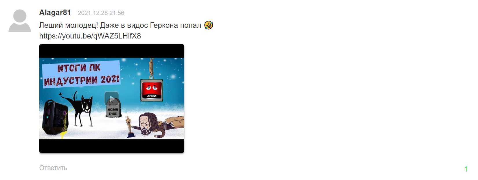 Об этом я узнал уже после Нового Года, причем значительно позже - где-то в феврале. А теперь представьте СКОЛЬКО Герыч поднял на нефанатах АМД :) Вот когда о нас напишут западные ресурсы - это уже будет что-то с чем-то. И таки да, в этом видосе наш портал не один раз назвали "срачепомойкой Всея Рунета". Как думаете - почему ?