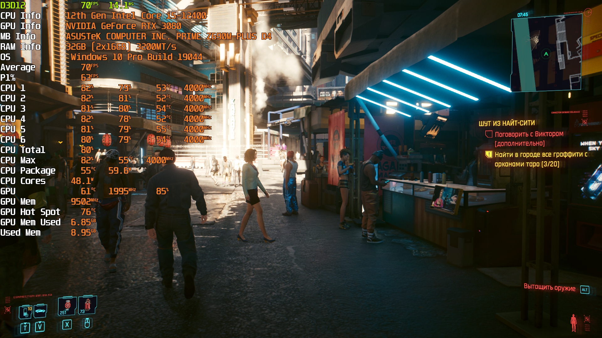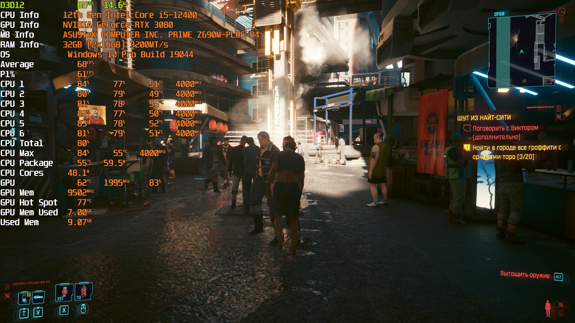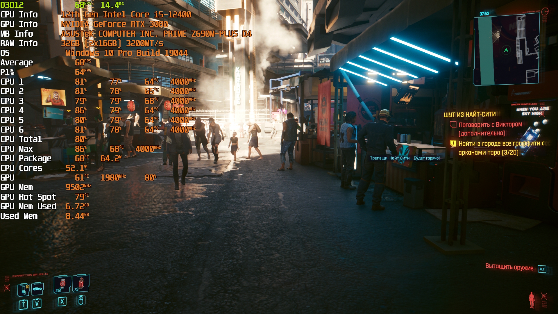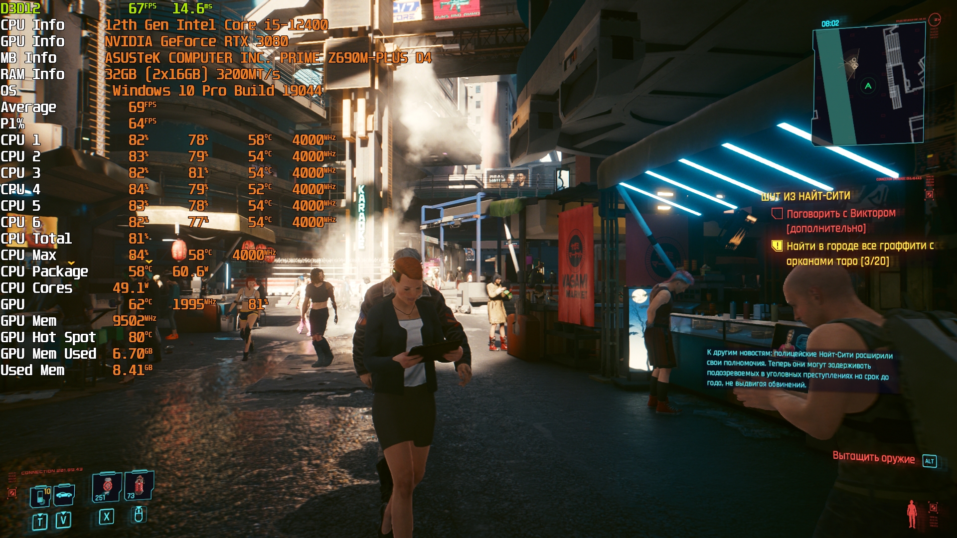 Cyberpunk 2077(GOG) - Маленький Китай, 1080р/Высокие (на 900 об/мин) с трассировкой на "Впечатляюще" и без нее. Плотность толпы - Высокая.