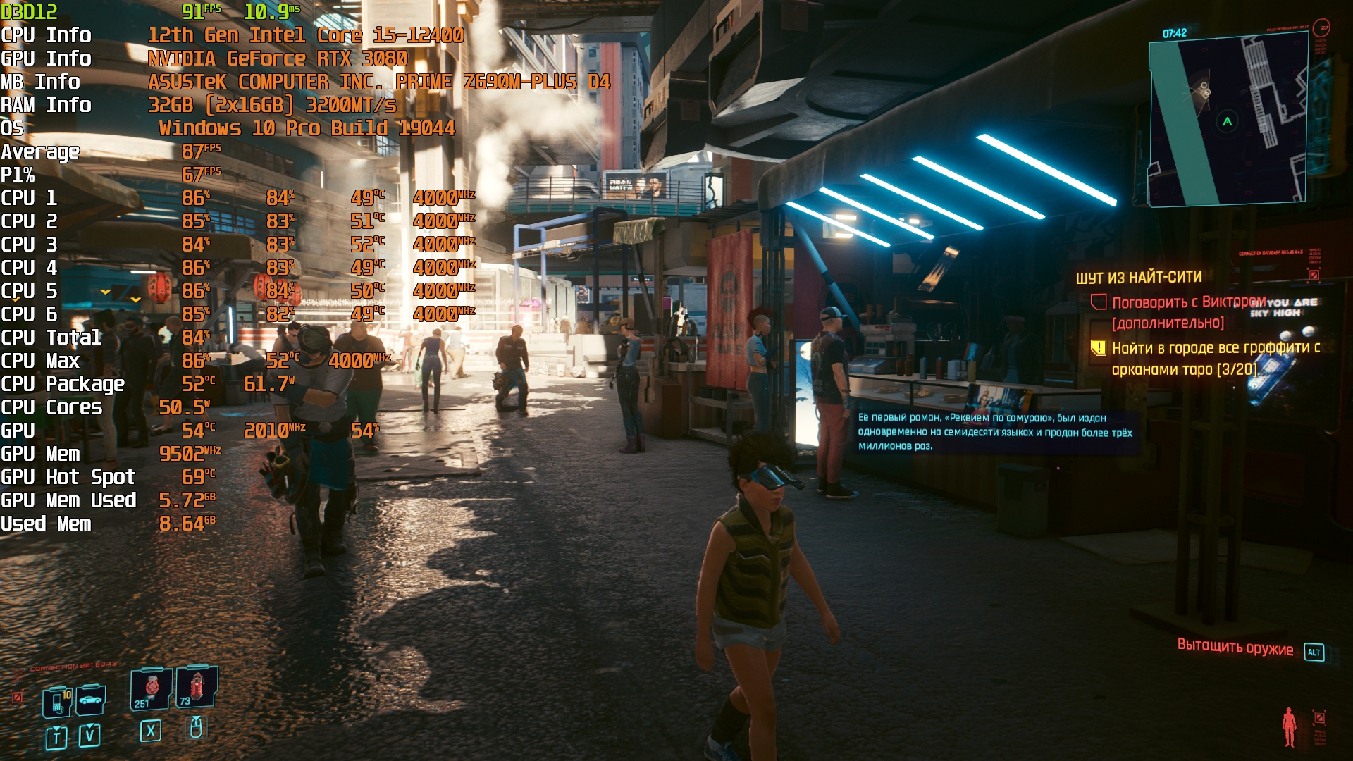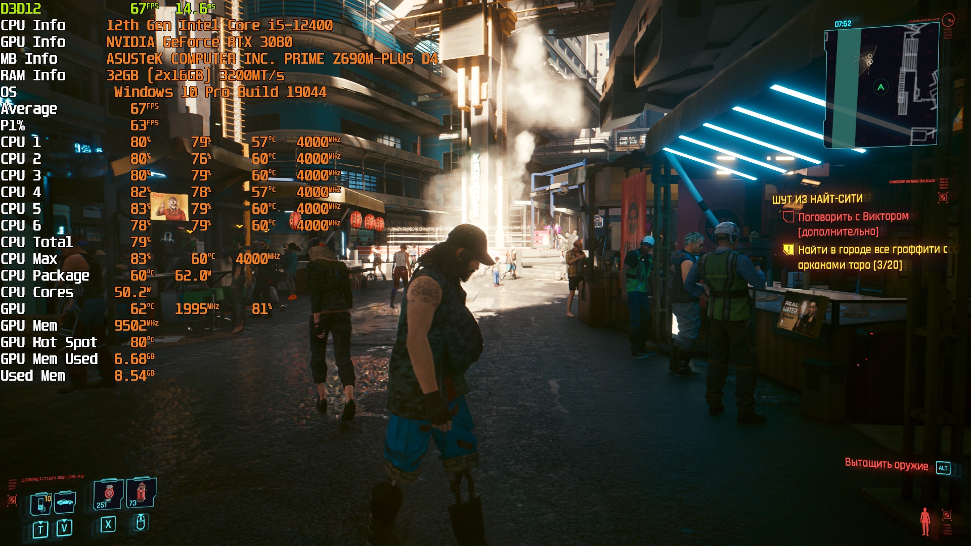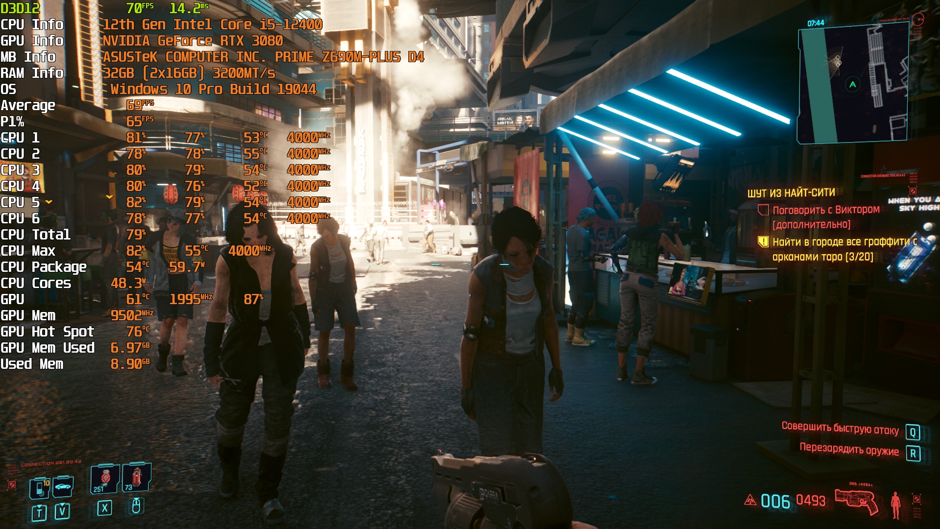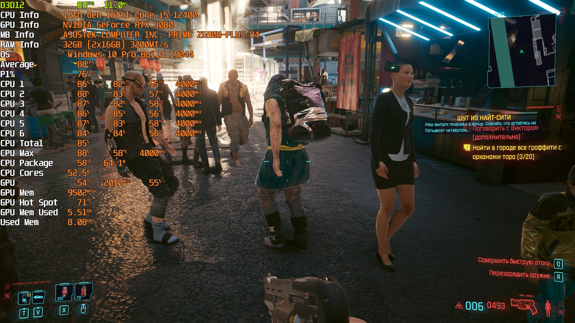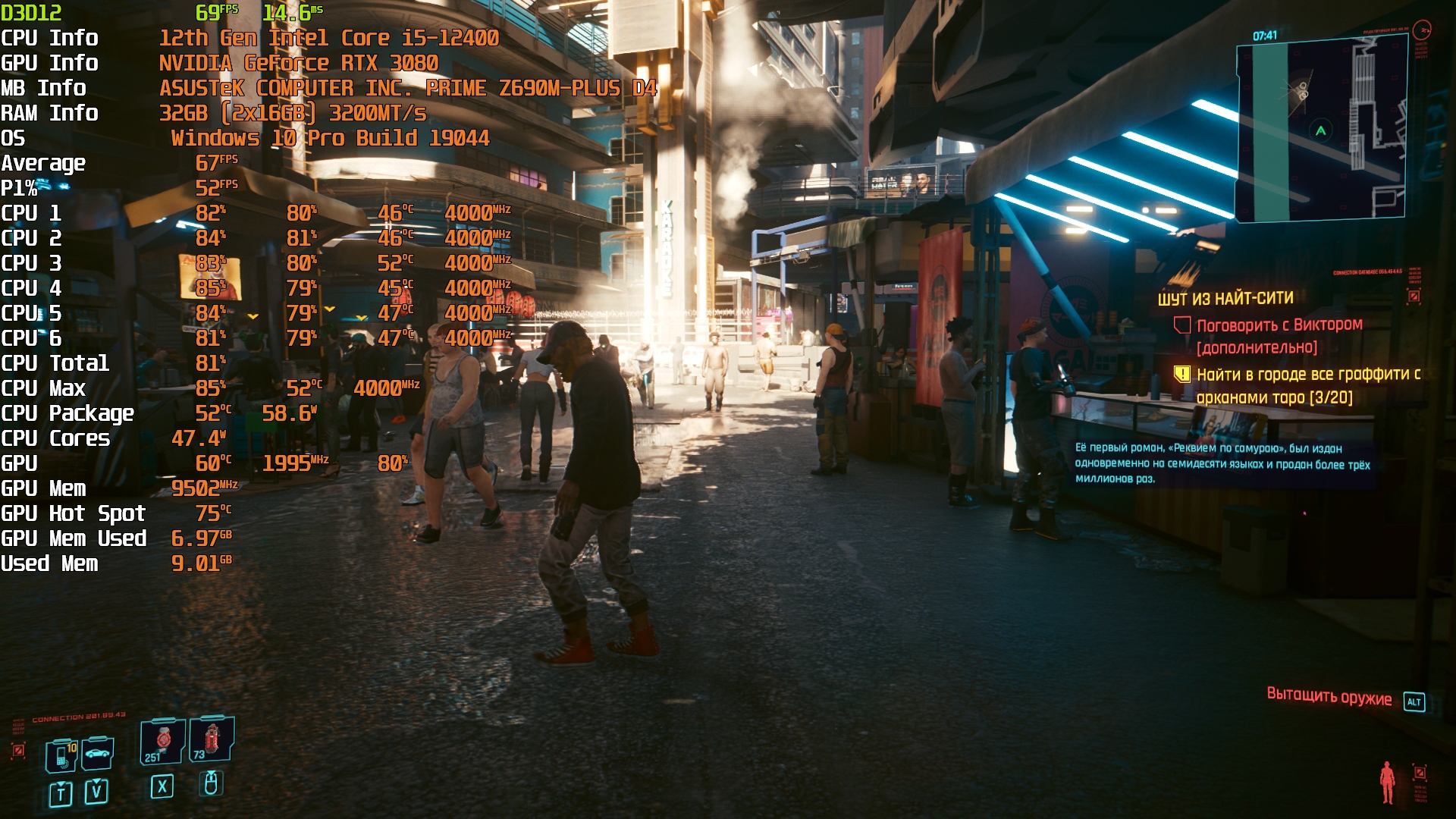 Cyberpunk 2077(GOG) - Маленький Китай, 1080р/Высокие (на 900 об/мин) с трассировкой на "Впечатляюще" и без нее. Плотность толпы - Высокая.