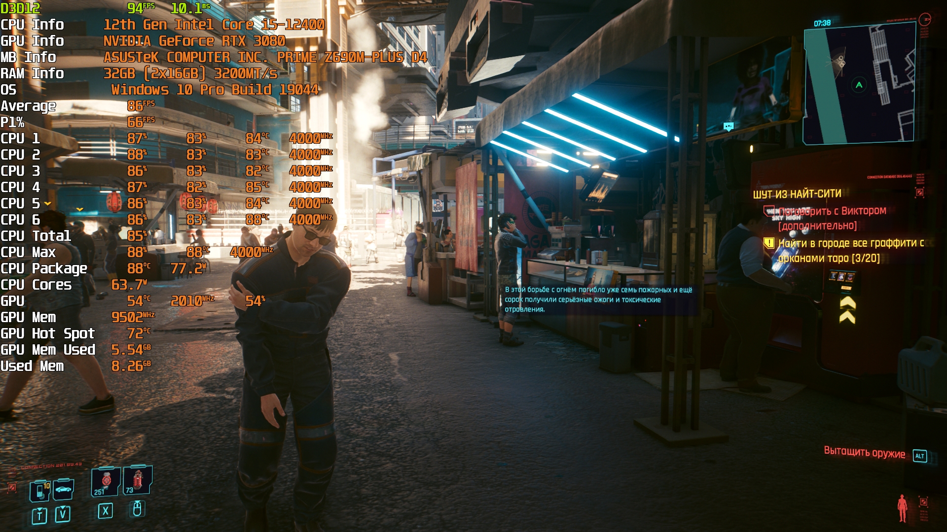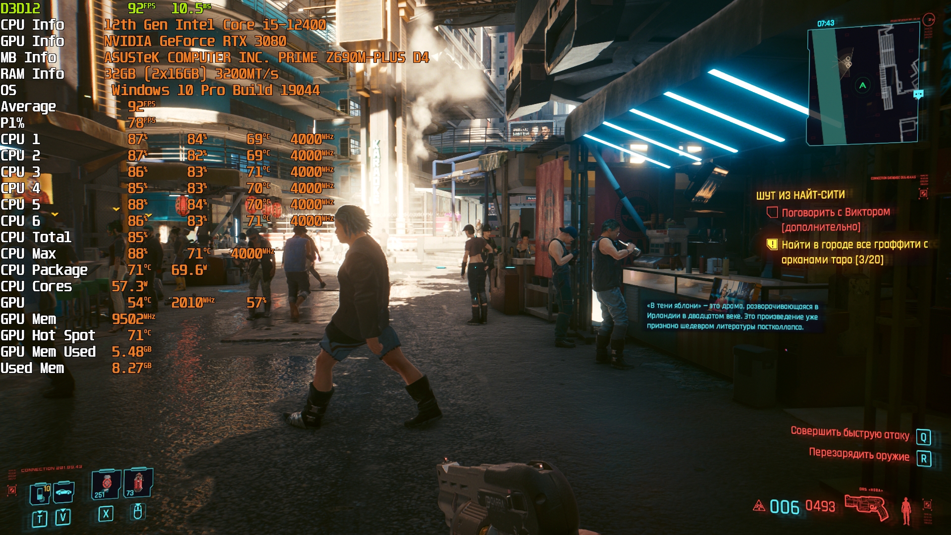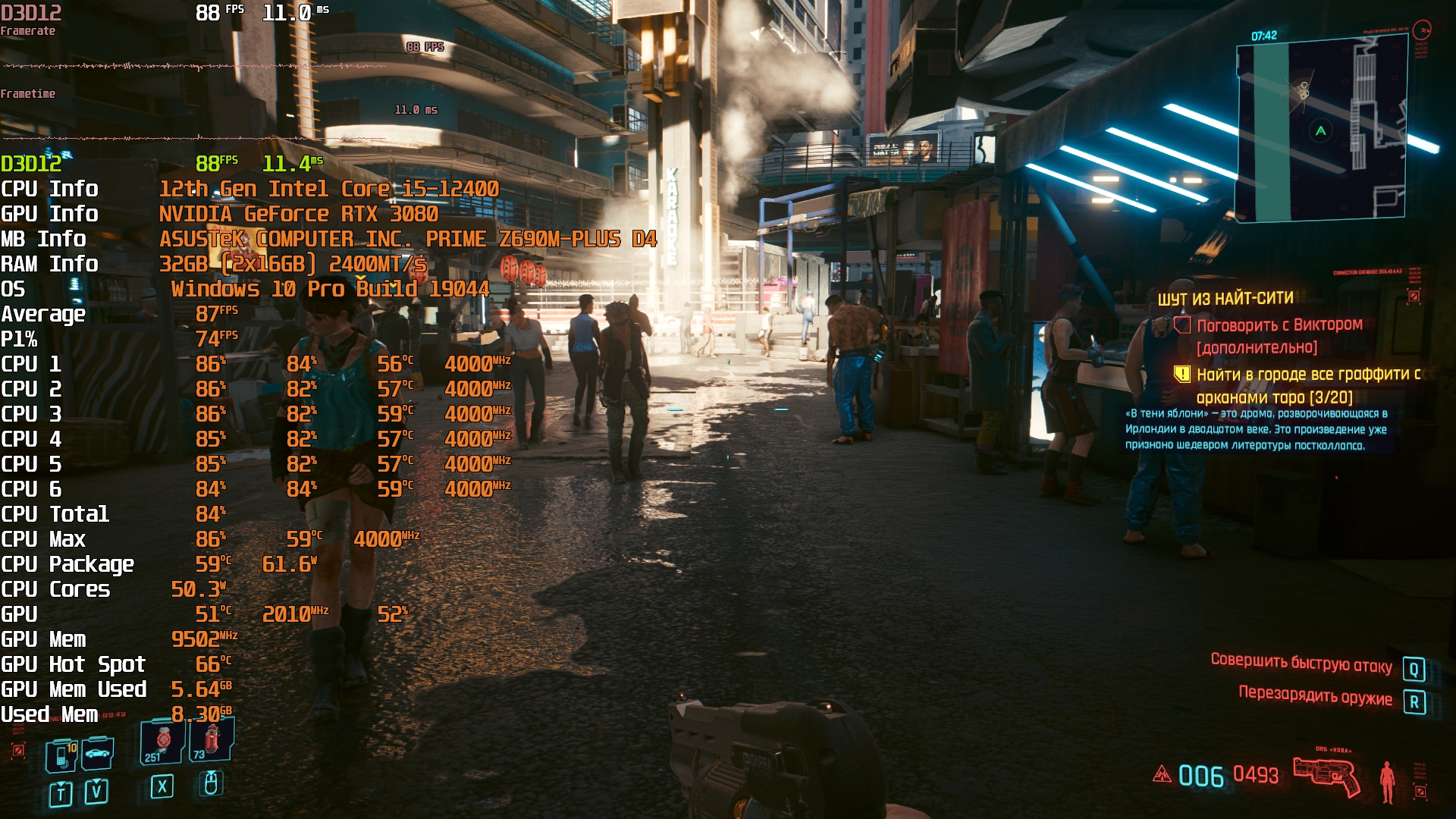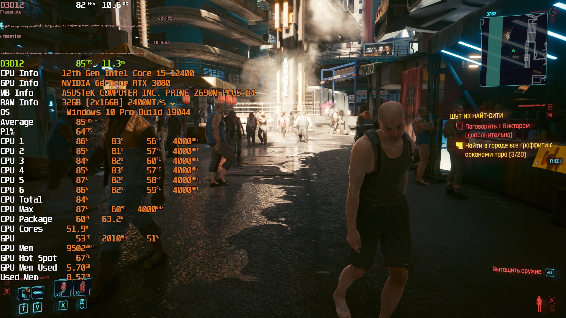 Cyberpunk 2077(GOG) - Маленький Китай, 1080р/Высокие (на 900 об/мин) с трассировкой на "Впечатляюще" и без нее. Плотность толпы - Высокая.