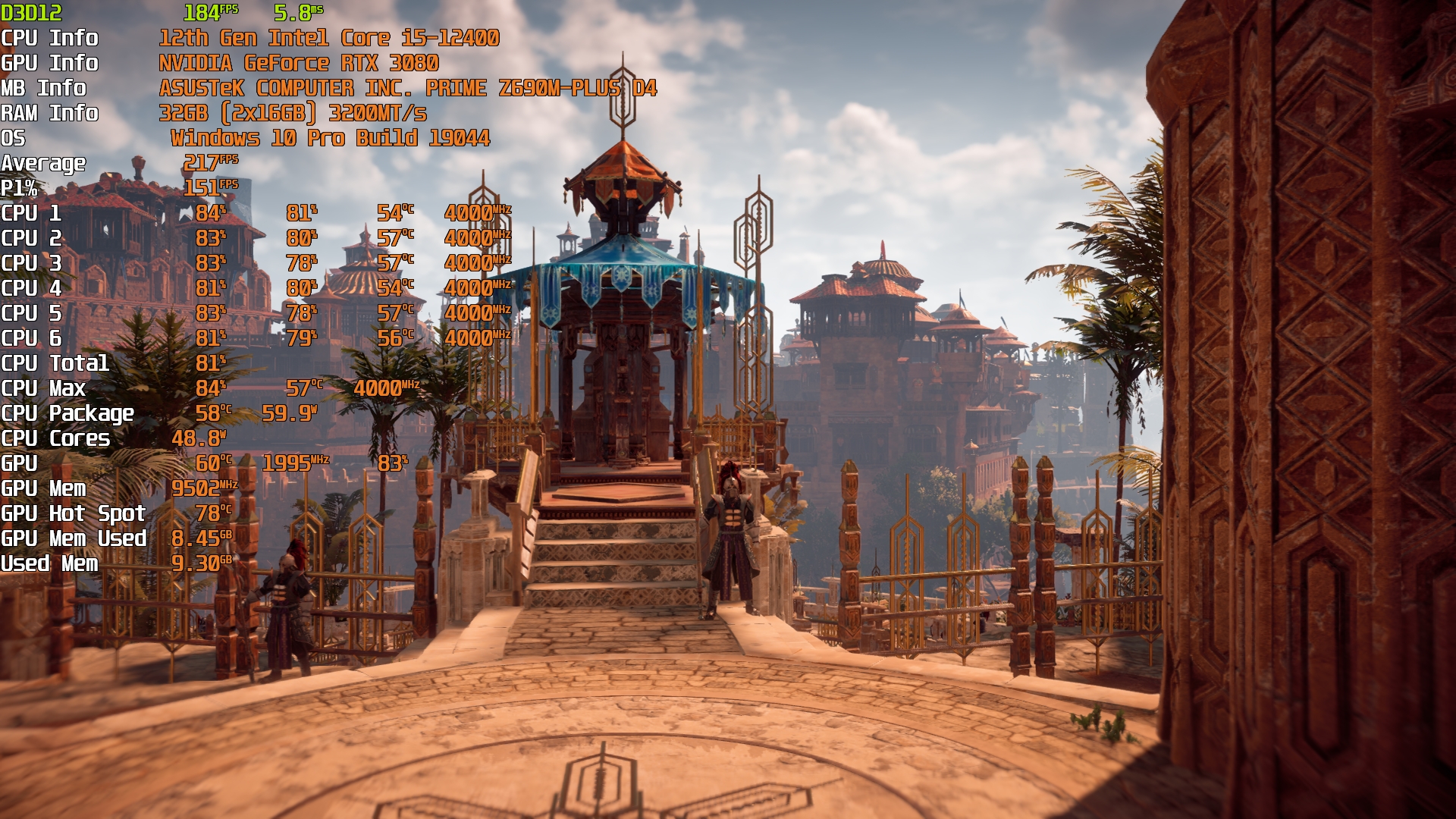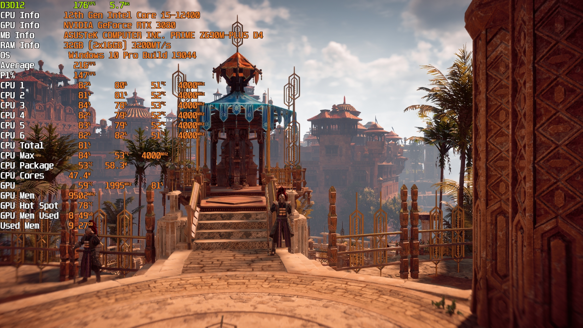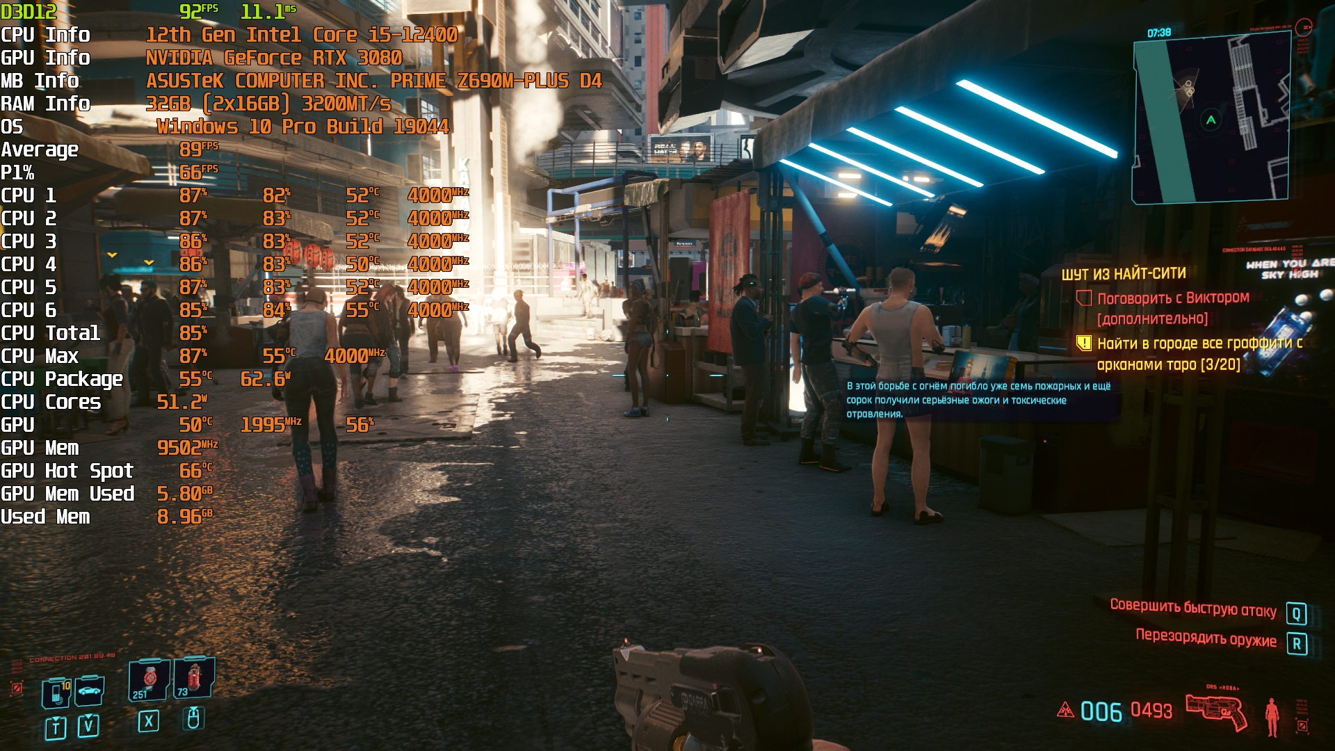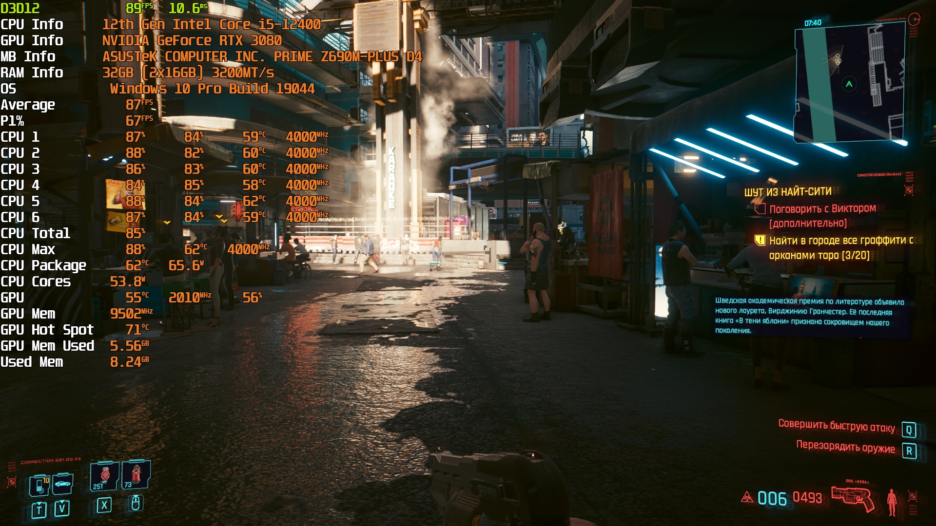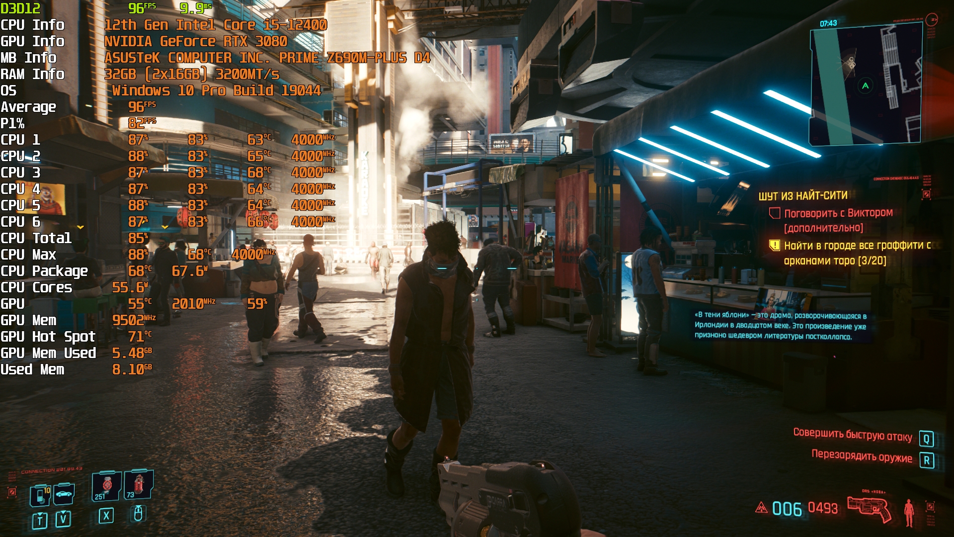 Cyberpunk 2077(GOG) - Маленький Китай, 1080р/Высокие (на 900 об/мин) с трассировкой на "Впечатляюще" и без нее. Плотность толпы - Высокая.