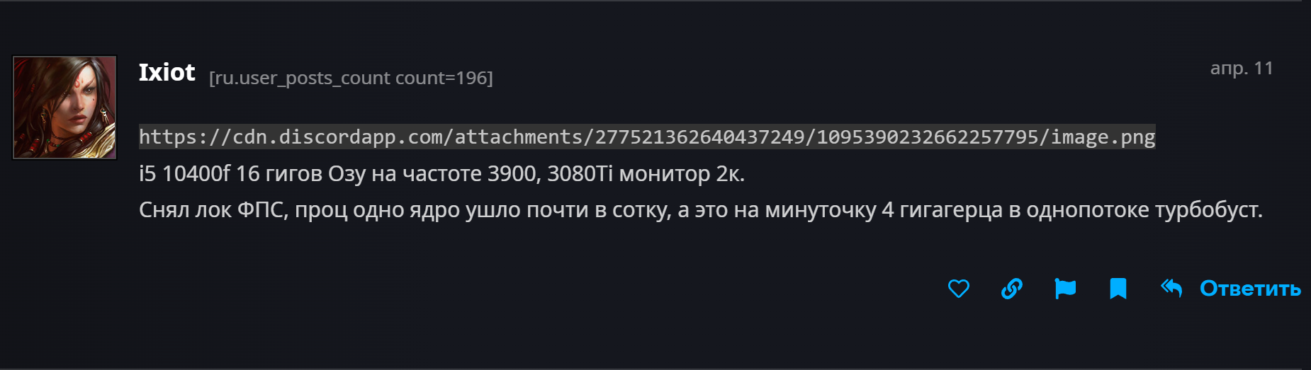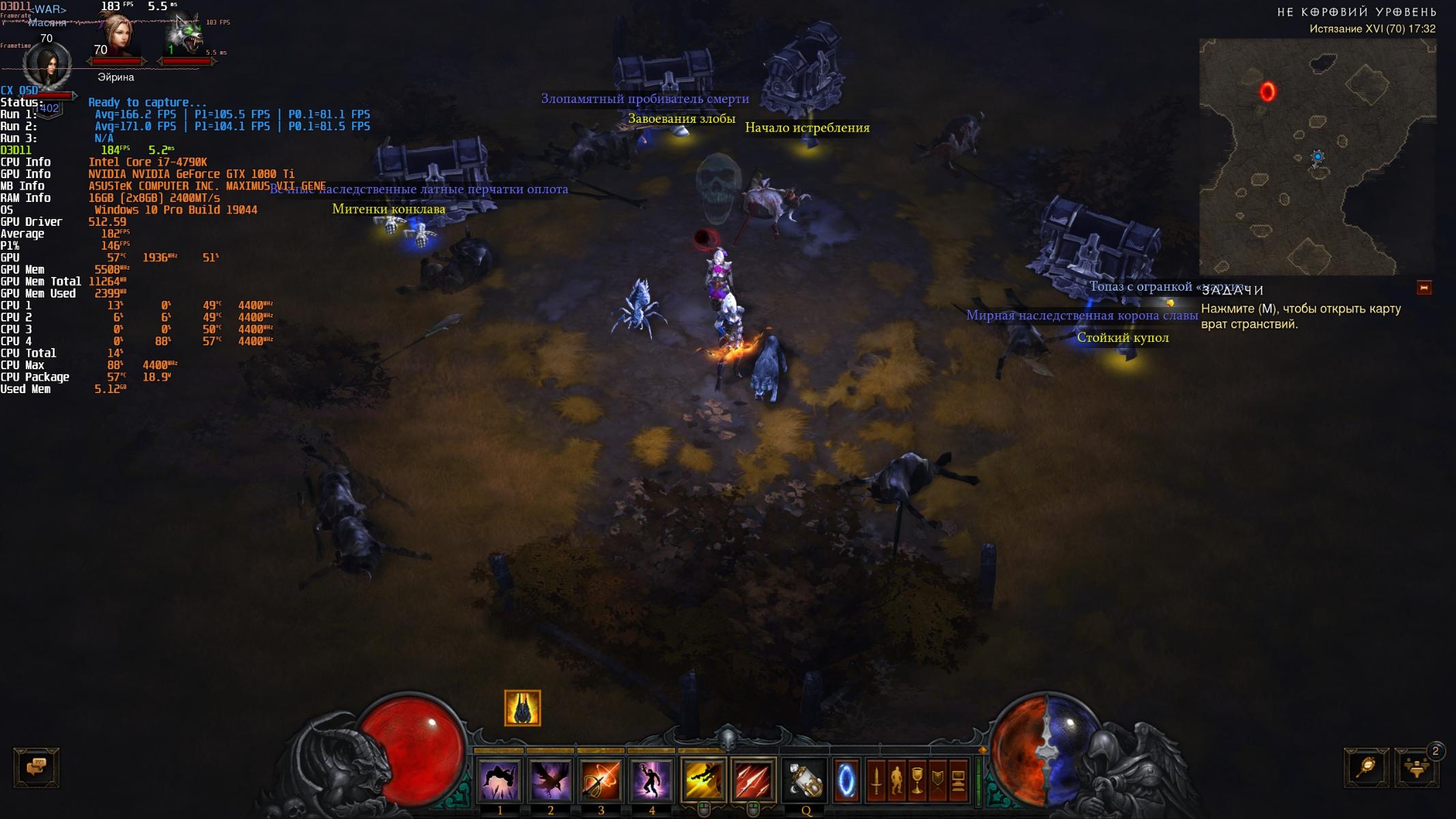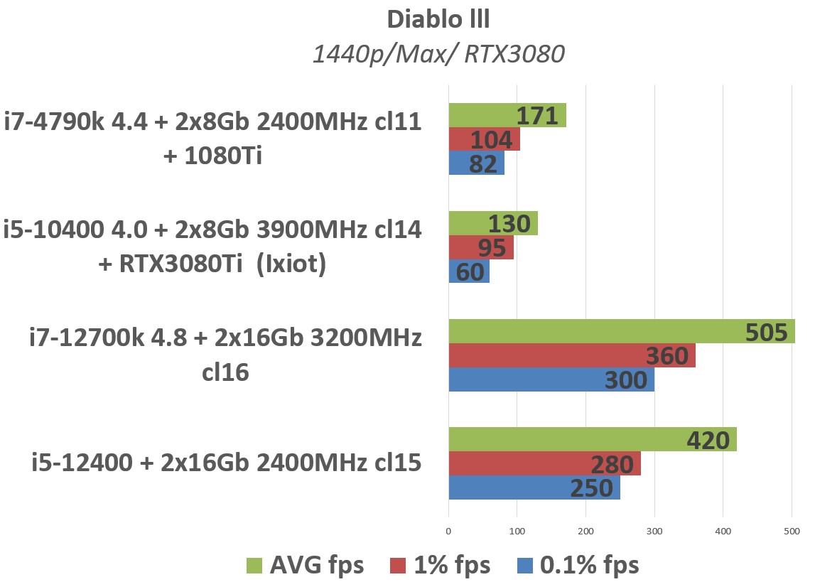 Дьябло 3 не самая новая игра, но обратите внимание на показатели фпс при разрешении 1440р с учетом железа у данного персонажа. Для сравнения предоставлю скрин со своей системой на 4790К+1080Ти :