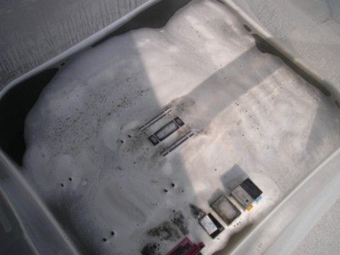 Как и следовало ожидать – первым взаимодействие кислоты можно было заметить на алюминиевых крышках электролитических конденсаторов(«разноцветные боченочки вокруг процессора»), так как алюминий металл активный. Следующей зоной активного воздействия стали металлические панели задней части материнской платы, за которой потянулись контакты IDE разъемов, разъем дисковода и слоты памяти. По прошествии первых 15 минут эксперимента, поверхность посуды покрылась густой белесой пеной, которая «напрочь» скрыла от нас ход дальнейшей реакции…