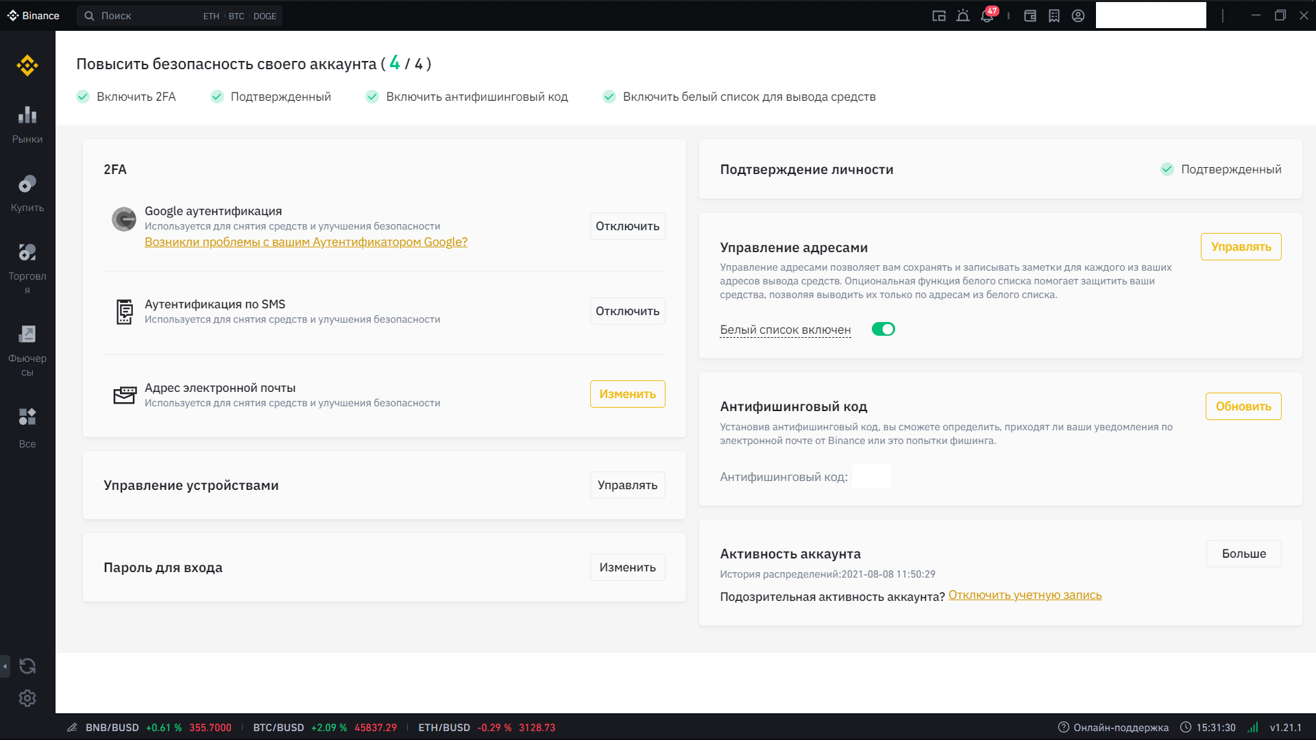 - Белый список для вывода средств (рекомендуется, если к вашему аккаунту получат физический доступ, то не смогут вывести криптовалюту к себе на счёт без 2FA кода)
