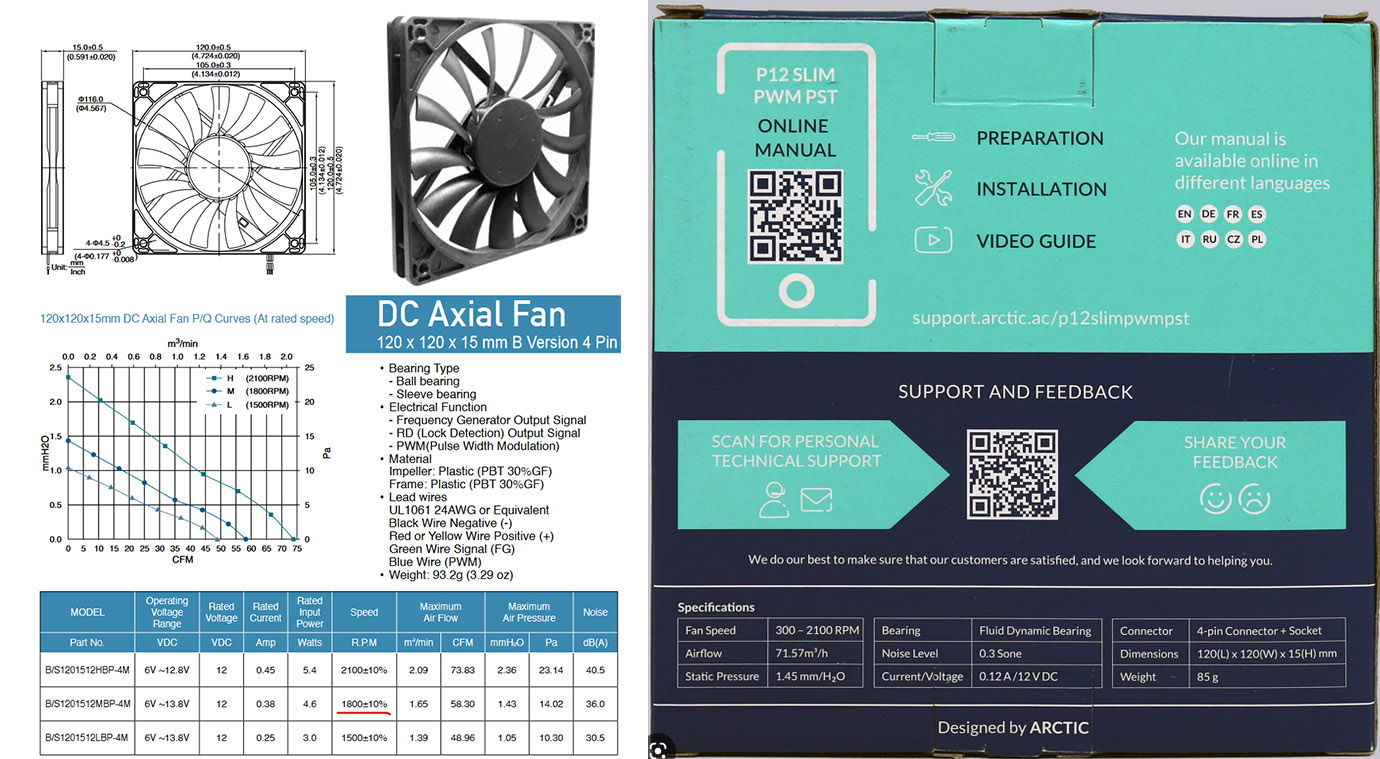 При сравнении характеристик мы видим, что заводской вариант имеет лучший показатель по максимальному воздушному потоку, а Arctic P12 SLIM имеет чуть более высокое статическое давление. При условии, что блок питания никогда не будет нагружен выше ~60%, разницей в характеристиках можно пренебречь.