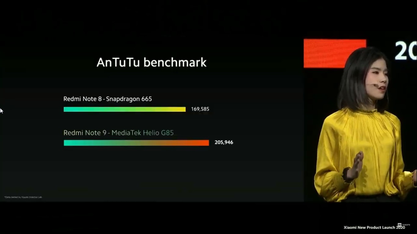 Смартфон получил новый процессор от тайваньской компании Mediatek под названием Helio G85, где «G» означает работу однокристальной системы на высоких частотах, обеспечивающих лучшую работу чипсета в играх. Специалисты компании Redmi на презентации сравнили работу нового гаджета в синтетическом бенчмарке Antutu со своим предшественником, Redmi Note 8(T), в результате новинка победила «восьмёрку» и набрала 205000 баллов, что почти на 40 тысяч превосходит оценку модели прошлого года.