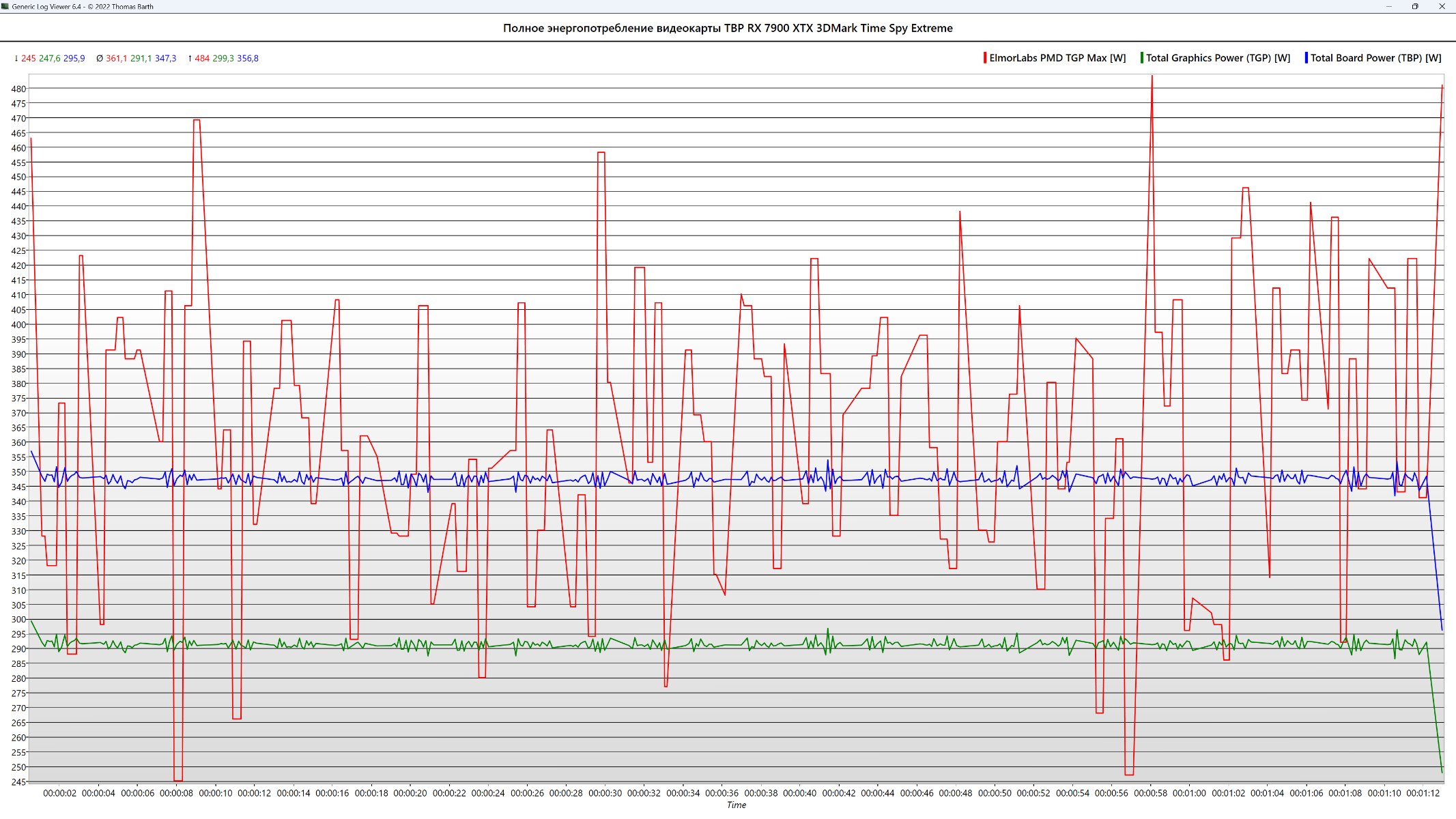 Полное среднее энергопотребление видеокарты составило по датчику ElmorLabs PMD TGP Max 361 Вт, а максимальное значение 484 Вт. Среднее значение датчика Total Board Power (TBP) - 347 Вт, максимальное - 357 Вт. Среднее значение датчика Total Graphics Power - 291 Вт, максимальное - 299 Вт. Разница по средним значениям между Total Graphics Power и Total Board Power составляет около 55 Вт.