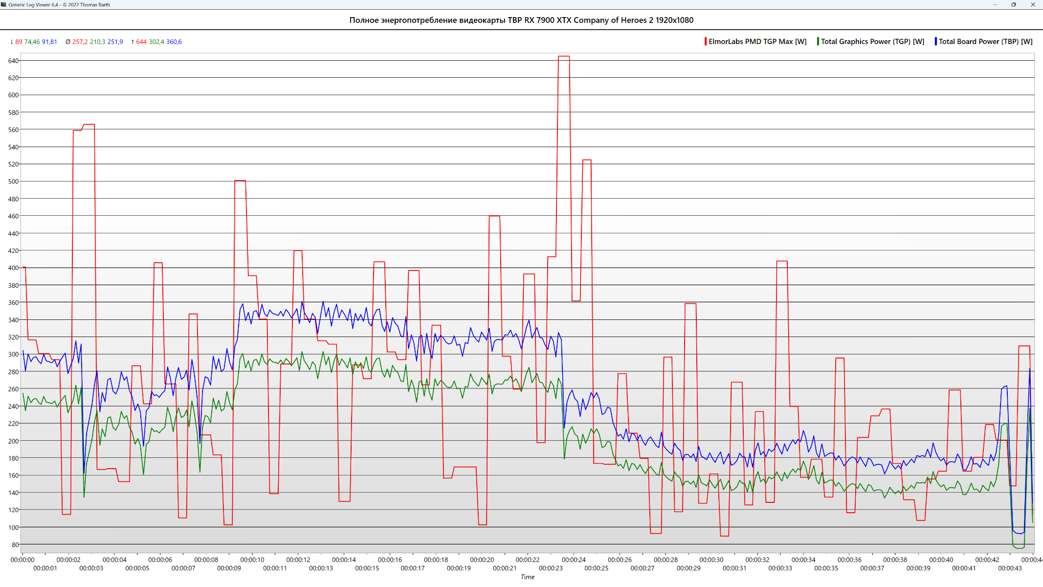 Полное среднее энергопотребление видеокарты составило по датчику ElmorLabs PMD TGP Max 257 Вт, а максимальное значение 644 Вт. Среднее значение датчика Total Board Power (TBP) - 252 Вт, максимальное - 361 Вт. Среднее значение датчика Total Graphics Power - 210 Вт, максимальное - 302 Вт. Разница по средним значениям между Total Graphics Power и Total Board Power составляет около 42 Вт.