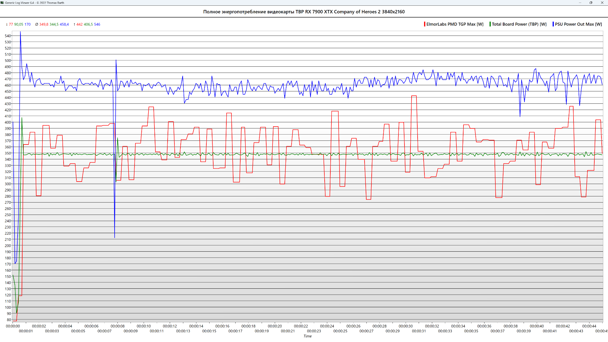 Полное среднее энергопотребление видеокарты составило по датчику ElmorLabs PMD TGP Max 350 Вт, а максимальное значение 442 Вт. Среднее значение датчика Total Board Power (TBP) - 345 Вт, максимальное - 407 Вт. Среднее значение датчика Total Graphics Power - 289 Вт, максимальное - 341 Вт. Разница по средним значениям между Total Graphics Power и Total Board Power составляет около 56 Вт.