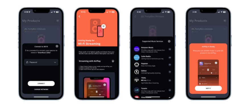 Используя приложение JBL One, можно легко управлять всеми функциями подключения. Поддержка Spotify Connect и Tidal Connect позволяет управлять музыкой напрямую через эти приложения, предоставляя более удобный пользовательский интерфейс. Интересная особенность Wi-Fi в PartyBox Ultimate заключается в возможности воспроизведения музыки высокого разрешения с нативной интеграцией сервисов Tidal, Qobuz и Amazon Music в приложении JBL One, что дает преимущество в качестве звучания.