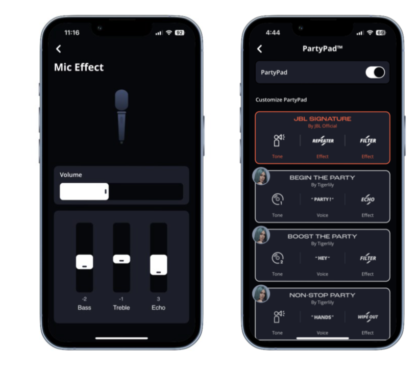 Для диджеев Ultimate предлагает разнообразные звуковые эффекты, управляемые через приложение. Также есть возможность настраивать звуковые эффекты, такие как гудок, царапанье винила и аплодисменты, и назначать их на панель управления сверху колонки для удобства использования.