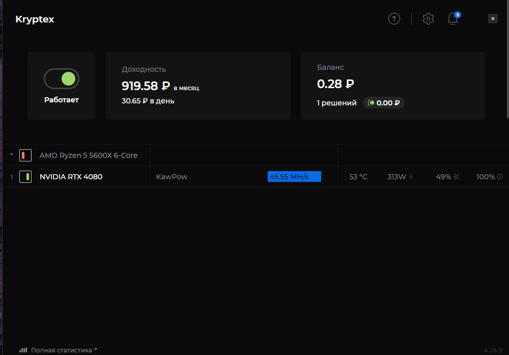 На алгоритме KawPow (RVN) выдаёт около 46 MH\s с настройками разгона Power limit 85%; Core Clock +190; Memory Clock +900