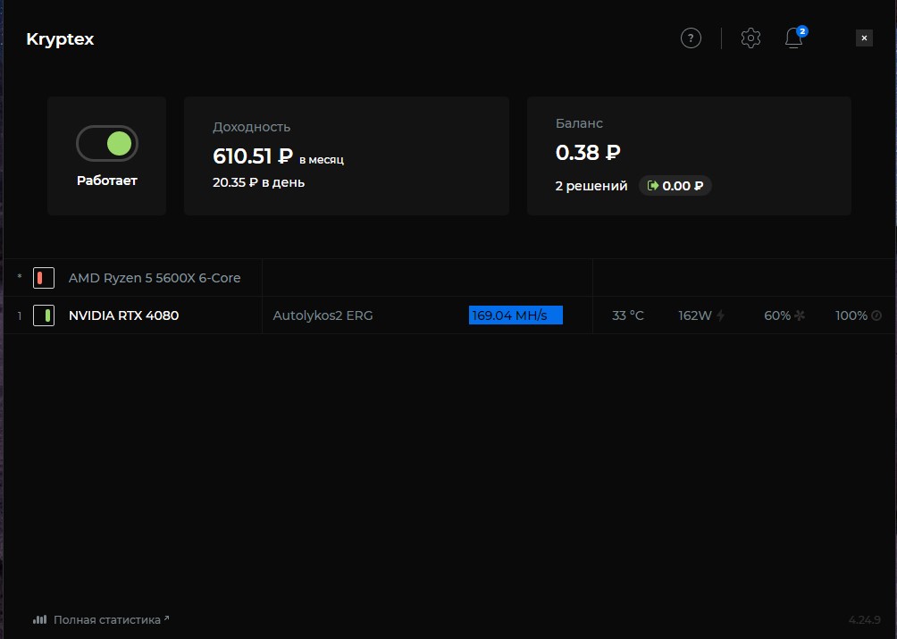 На алгоритме Autolykos2 (ERGO) выдаёт около 170 MH\s с настройками разгона Power limit 90%; Core Clock +200; Memory Clock +1000.