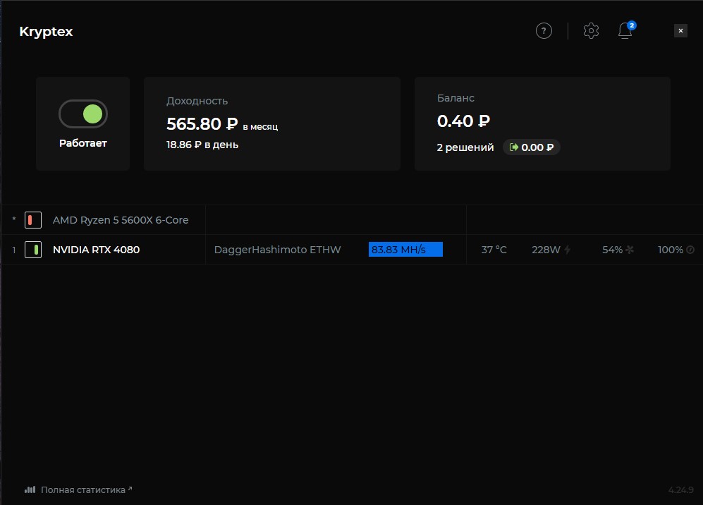 На алгоритме Ethash (ETHW, ETC, UBQ, EXP) выдаёт около 88 MH\s с настройками разгона Power limit 85%; Core Clock 0; Memory Clock +1000.
