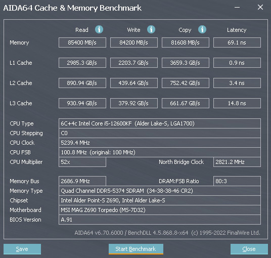MSI MAG Z690 Torpedo, 12600KF, 32 Gb оперативки (5200MHz). Все в легком разгоне. Особо нравится результат по памяти с настройкой всех таймингов, включая вторичные и вообще неизвестно какие.