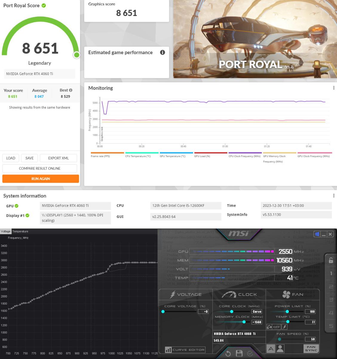 Но! Появилась надпись Legendary, а что более внезапно: в Топ 100 3DMark Port Royale карта вошла на 90 месте среди 4060ti. А я как то даже еще и не начинал. То ли карт этих у народа мало, то ли конкретно это крайне удачный экземпляр.
