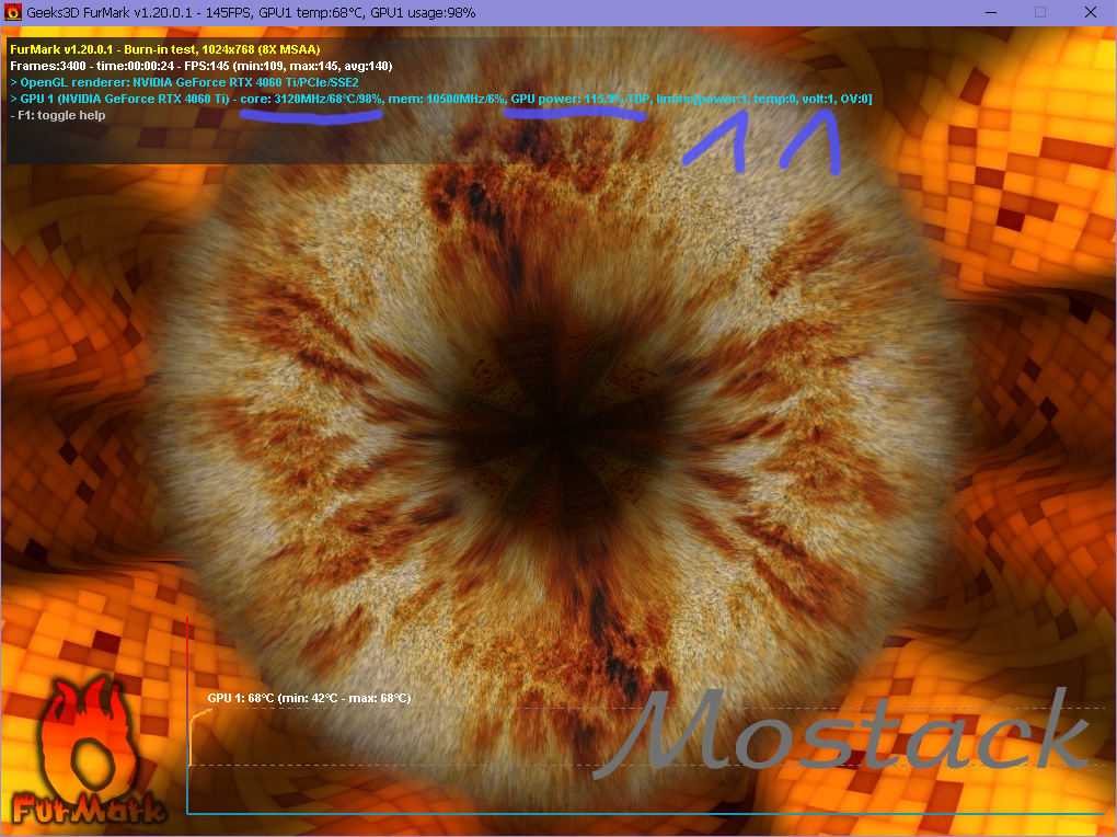 Этот предельный режим удалось погонять в FurMark (благо там настройками можно подогнать под практически любой диапазон работы):