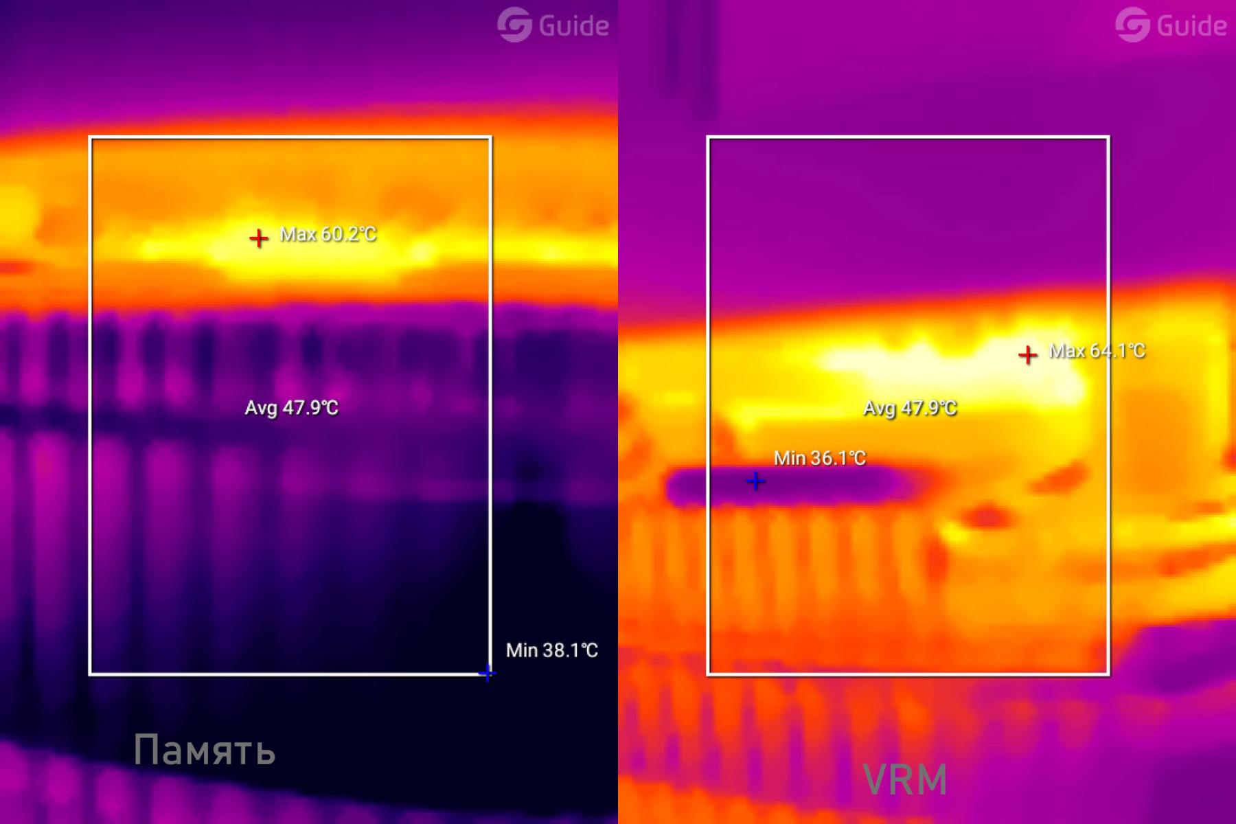 На всякий случай проверил температуры памяти и VRM тепловизором (уж как смог подлезть) - более чем хорошо. Память до 62С, VRM до 67С.