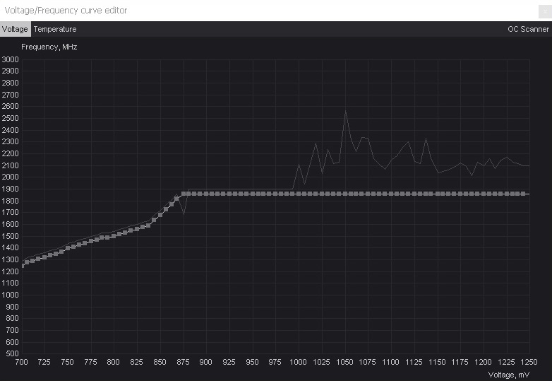 Опять же в синтетике карта отказывалась держать эти 1875 МГц, да и вообще при сильной нагрузке съезжала на пару ступеней. Тут уже вмешивается логика работы карты — повышать напряжение при росте температуры. Только кривая обрезала все эти более высокие напряжения и карта сбрасывала частоты. Продолжил кривую чуть выше с увеличением напряжения.