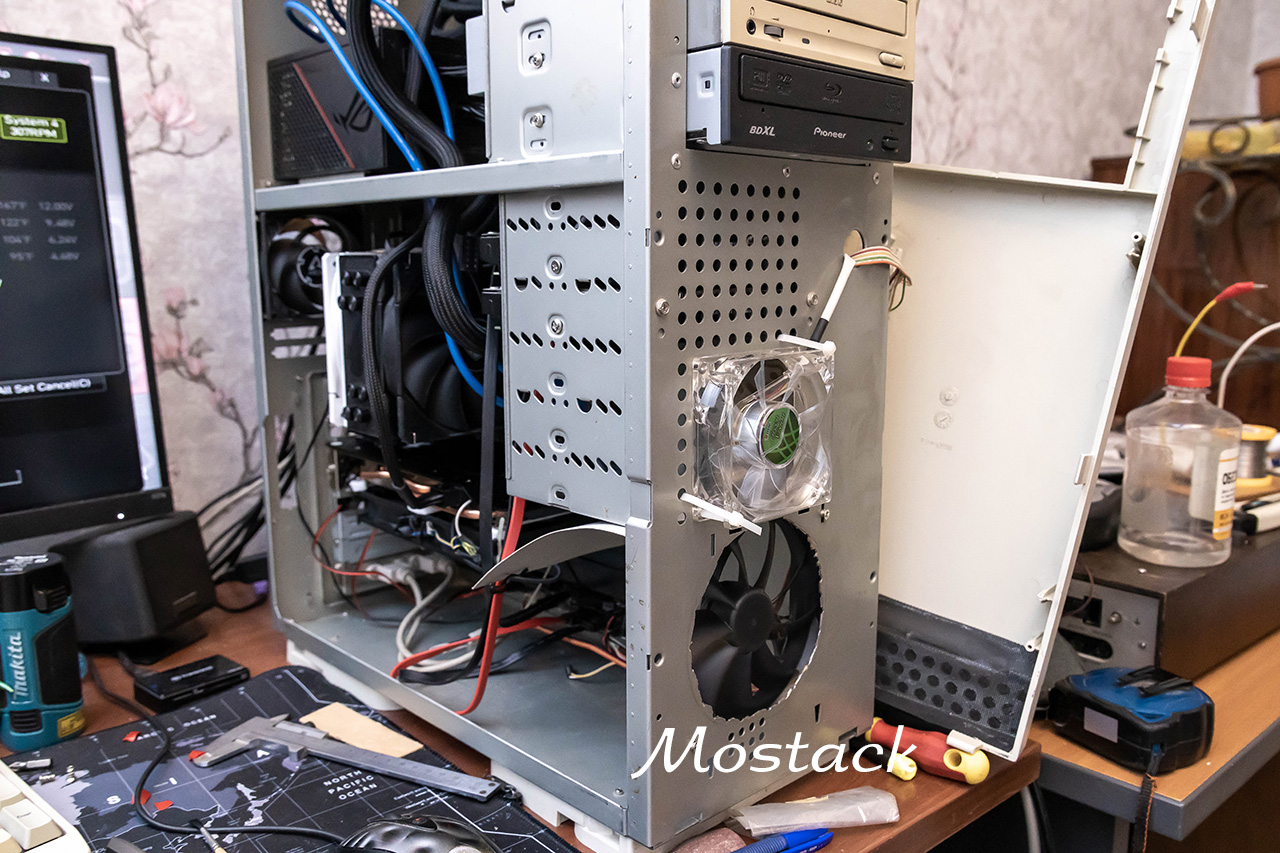 Каждый этап снижал температуру. Параллельно настраивались обороты всех этих вентиляторов. Последнее что сделал — заменил проставки на 2 мм (тут уж без фото, развивайте воображение): вентиляторам стало еще тяжелее и максимальные обороты упали до 1890. Это сняло еще 1 градус, на котором у меня все идеи кончились. Можно было бы совсем проставки убрать, но как бы каркас вентиляторов не стал местом сборки пыли. Так хоть все выдувает. Ну и минус 6 градусов — это больше, чем я ожидал. Причем 1-2 градуса из оставшихся вина исключительно корпуса. Они набирается минут за 10, когда корпус прогреется и стенки становятся теплыми. Не хватает 80мм вентилятора на выдув. Вряд ли что-то тут буду еще делать. И так все в допустимых пределах.
