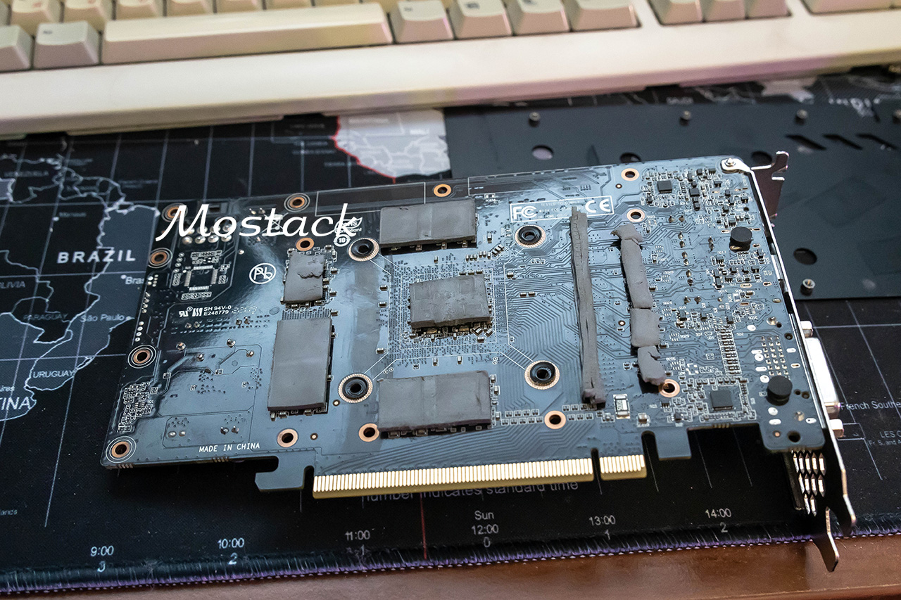 А теперь собираем все это в одну кучу. Родные китайские термопрокладки раскладываем под бэкплейт. Почти хватило. Там 3мм зазор, но как раз на местах размещения сидит куча элементов с высотой 1мм — легло хорошо. Вот теперь бэкплейт стал реально горячим! Над зоной VRM рукой потрогать уже на грани. Так что сколько то ватт и сюда ушло.