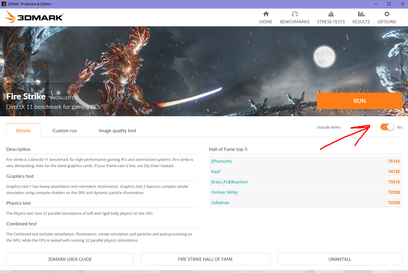 И вот тут я понял как я лоханулся! Оказалось, что существует маааленькая кнопочка, под названием "Include Demo" при запуске теста. Для тестирования стабильности она полезна: демо идет долго и прогревает карту почти до максимума. Но вот для заливки результатов на сайт это демо вообще не имеет значения и его можно отключить. Голый тест мало того, что проходит намного быстрее, так еще и прекрасно засчитывается. Знал бы - сделал бы все гораздо раньше.