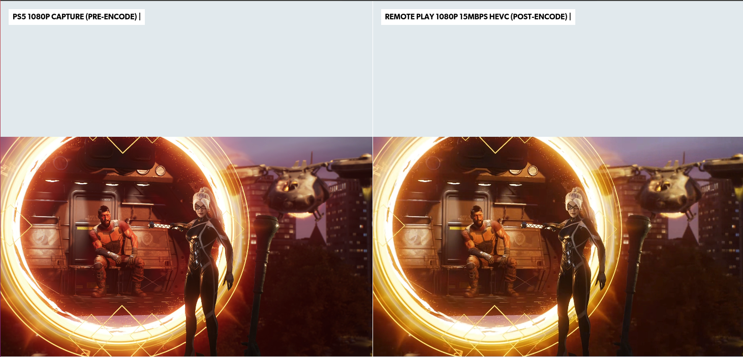 Я использовал клиент для удаленного воспроизведения с открытым исходным кодом Chaiki, чтобы обеспечить потоковую передачу на свой компьютер такого же качества. При этом я одновременно записывал исходные данные с моей PlayStation 5, настроенной на разрешение 1080p.Таким образом, мы должны увидеть удаленное воспроизведение до и после сжатия. Ниже приведён скриншот, на котором вы можете увидеть разницу.