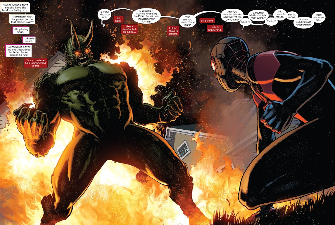 Майлз Моралес прибыл из другого мира, который очень похож на вселенную 616. Но в той альтернативной реальности Питер Паркер погиб в сражении с Зелёным Гоблином.