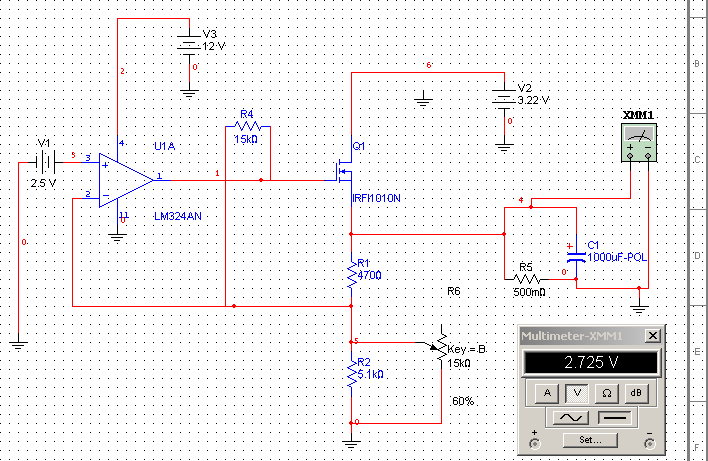 Детали и номиналы не совпадают, но это не важно. Q1 на схеме наш мосфет, U1A - один из четырёх операционников LM324, V1 - 2.5В (на видеокарте идут со стабилизатора очень мелкой конструкции), V2 - напряжение, идущее на вторую(D) ногу мосфета с другой стороны получаем стабилизированное напряжение. Это напряжение возвращается через резистор R1, на минус операционника. Пара резисторов R1 и R2 составляют делитель этого напряжения. Если уменьшать напряжение между этими резисторами то, на выходе операциооника будет подниматся напряжение, открывая сильнее мосфет (что в общем то нам и нужно). Понизить это напряжение можно двумя способами: либо увеличивая R1, либо уменьшая R2. Обычно при вольтмодах уменьшают сопротивления, т.к. это физически легче зделать. Достаточно паралельно R2 подпаять переменный резистор. Что я и зделал.
