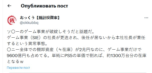 Один японский аналитик с 1200 подписчиков из запрещенной в России социальной сети выдал достоверную информацию, и свой расклад по ближайшему бедующему консоли, а за одно и стоимости акций японского гиганта. Во всех новостных заголовках идентичная информация и специалисты сходятся во мнении, что боссы Sony водят людей за нос и скрывают правду. Они указывают произведенные консоли, а не проданные. На складах скопилось более 13 млн устройств, и корпорация не знает, что с ними делать. Провал PlayStation Portal, PlayStation VR2, Marvel’s Spider-Man 2 просто уничтожают корпорацию.