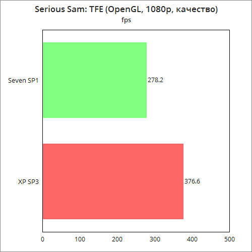 Настройки использовались идентичные настройкам из предыдущего материала. Прогнав тест в игре Serious Sam: TFE видим, что результат в среде Windows XP получается выше на 35% при использовании OpenGL рендера.
