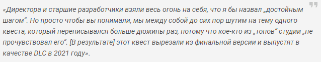 На примере рассказывается о квесте, реализация которого не понравилась руководство, поэтому его пришлось переделывать по нескольку раз, в итоге он был и вовсе удалён. И так с большей частью контента, вырезанного из финальной версии игры просто из-за прихотей начальства. К слову, анонимус в своём послании говорит, что на высокие должности назначаются те люди, которым доверяют, можно понять почему талантливые кадры отсеиваются.