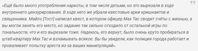 Вина цензуры тоже сказалась на игре: из-за неё были выпилены различные побочные занятия, которыми мог бы заняться главный герой. Этого очень не хватает в Cyberpunk 2077. Так была вырезана возможность принимать наркотики, понятно почему идея не получила одобрения.