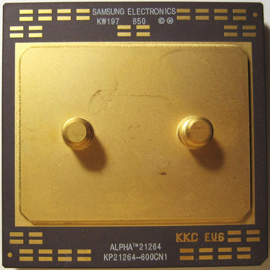 Digital Equipment Corporation (DEC) — американская компьютерная компания, была основана в 1957 году Кеном Олсеном и Харланом Андерсоном. В конце 90-ых компания выпускала микропроцессоры класса RISC на архитектуре Alpha. Шину ввода/вывода EV-6 использовал процессор Alpha 21264. AMD просто лицензировала данную шину у компании DEC, как самую перспективную в то время. И так EV-6 — высокопроизводительная шина, работающая на частоте 100МГц на первых процессорах AMD Slot A, однако в отличие от Интеловской GTL+, передача данных по шине ведется на обоих фронтах сигнала. Потому фактическая частота передачи данных составляет 200МГц. Уже на момент лицензирования данной шины AMD, EV-6 демонстрировала работоспособность вплоть до частоты 166 (333) MHz с пропускной способностью до 2,7 Gb/s, что сулило достаточно неплохие перспективы. Вот тот самый процессор Alpha 21264.