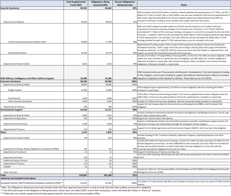 Согласно опубликованной директором Офиса менеджмента и бюджета Шаландой Янг таблице, датируемой августом, суммарное количество финансовых средств, потраченных из государственного бюджета Соединённых Штатов Америки на экономическую, гуманитарную и военную помощь Украине, составило 101,198 миллиардов долларов.