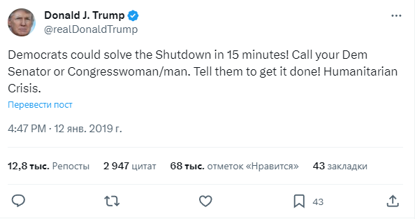 Перевод: «Демократы могут решить проблему шатдауна за 15 минут! Позвоните своему сенатору-демократу или конгрессмену. Скажите им, чтобы они сделали это! В стране наступил гуманитарный кризис»