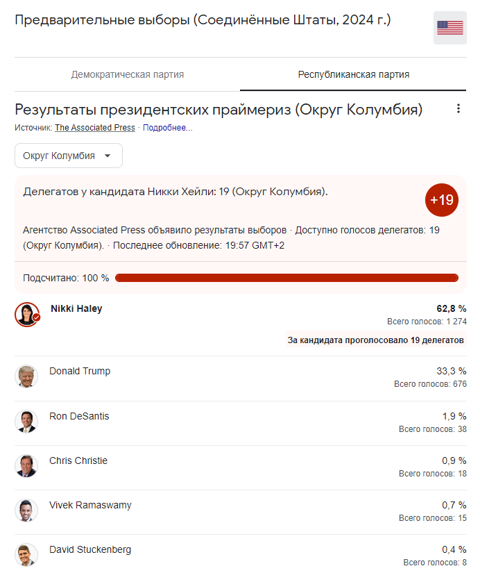 Стоит отметить, что под округом Колумбия речь идёт о столице Соединённых Штатов Америки - Вашингтоне. Издание Associated Press уже ранее писало, что именно в американской столице Хейли имеет лучшие шансы на победу.