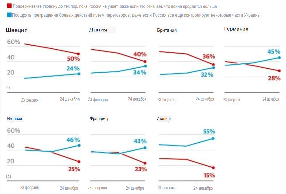 Издание The Guardian поделилось данными организации YouGov по итогам декабрьского социологического опроса, проведённого сразу в семи европейских странах - Великобритании, Германии, Франции, Италии, Испании, Швеции и Дании. Основной темой был российско-украинский конфликт и поддержка Украины. Отмечается, что зафиксировано существенное падение поддержки Украины среди местного населения.