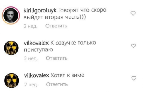 Александр Вилков, актёр озвучки, который стал голосом бравых бойцов "Долга" из трилогии, написал в своём инстаграме, что начал озвучивать новых персонажей в S.T.A.L.K.E.R. 2, добавив к этому следующую фразу: "Хотят к зиме.". Скорее всего, имелся ввиду релиз игры.