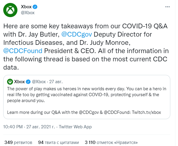 В официальном Twitter подразделения Xbox появился твит, где компания выражает свою поддержку вакцинации. Игровое подразделение даже провело прямую трансляцию на Twitch в формате "Вопросы-Ответы" на тематику вакцинации.