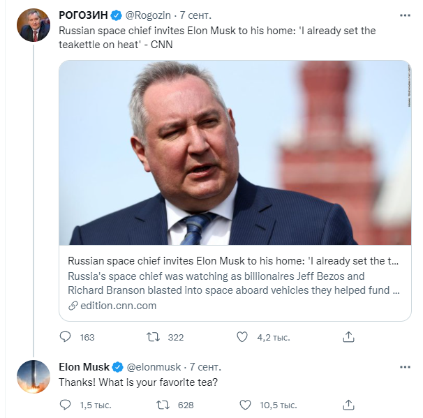 Сам Илон Маск не растерялся и спросил в Twitter какой чай предпочитает Дмитрий Рогозин. Глава Роскосмоса сообщил, что неплохо было бы начать с индийского чая, который любила его бабушка.