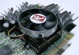 Тот что левее ( синий, измазанный КПТ8 ) подключён к плате управления оборотами вентилятора, позаимствованной из старого блока питания, она закреплена на “спине” видеокарты. Другой это термодиод подключаемый к материнской плате. Над радиатором установлен вентилятор всё от того же cooler’а. Наклейку я сохранил старую. ATI – это звучит гордо! (© М.Горький)