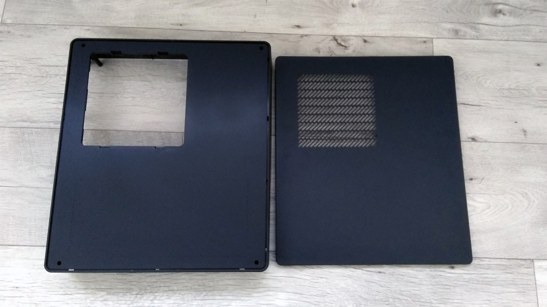 Крышка корпуса состоит из двух частей- основная пластиковая и металлическая вставка. Чтобы снять металлическую вставку, достаточно отогнуть проушины по периметру и аккуратно вытолкнуть её наружу.